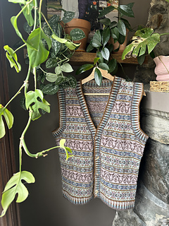 Sheep Meadow is a Fair Isle ladies’ waistcoat / buttoned vest using 12 different colors of Spindrift; 19 balls in all. Colors used: