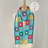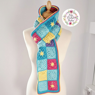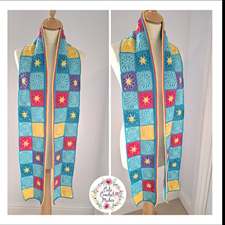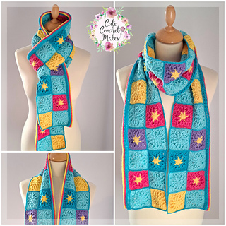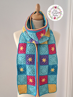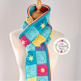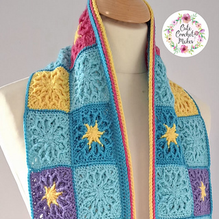 The Shine Bright Scarf is a colourful, eye-catching accessory made from Extra Fine Merino yarn. The pattern consists of a single, small granny square featuring a mandala-inspired design, with some squares showcasing a charming yellow star centre. The squares are crocheted together with a simple back-loop edge border. The pattern uses basic stitches combined with front-post details making it suitable for intermediate crocheters.