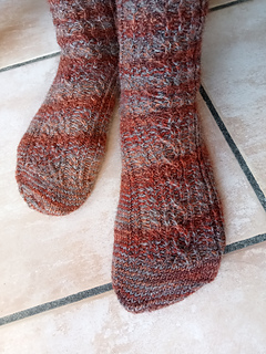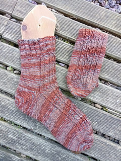 A toe-up sock with afterthought heel and a nice pattern of cables and ribbing stitches.