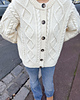 The Sirena Cardigan is a drop shoulder style cardigan worked top to down. The back yoke is worked in cables while shaping the shoulder slope with short rows, then continued to the yoke with armhole shaping. After this, stitches are picked up for each shoulder and worked to the yoke. When the back and the front pieces are joined together, the body is worked back and forth to the hem. The sleeves are picked up around the armhole, then worked in the round to the wrist. The button bands are picked up and worked along the front edges. The neckband features a double-knit folded detail, creating a stable and structured fold. The buttonhole on the neckband is worked on both sides of the folded neckband using a pick-up technique to avoid extra sewing. Finally, the neckband is finished with the Kitchener stitch for a neat edge even on the WS.