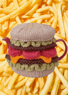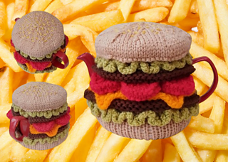 This TeaCosyFolk pattern celebrates the art of playful knitting with a cosy shaped like a fully loaded cheeseburger.