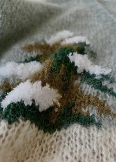 The kit contains the necessary amount of Puppy Julika Mohair (9 balls or a total of 918 m, for the grey sky and the beige snow), smaller amounts of (unidentified) yarn for the skier and the tree (feels like wool) and some (unidentified) glittery synthetic for the snow that covers the tree.