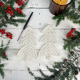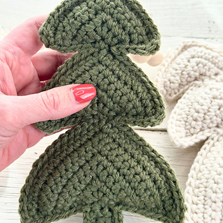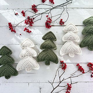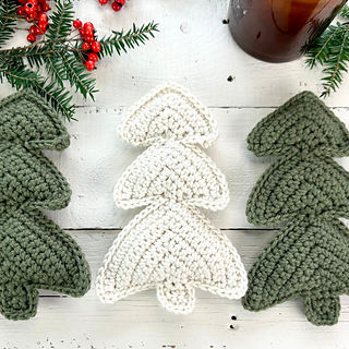 Each tree is made of two flat panels, crocheted in rows, that are then joined along the edges using single crochet and lightly stuffed. This is an Easy level pattern and is mainly worked in single crochet with a little increasing and would be suitable for a beginner who is ready to move beyond washcloths and coasters.