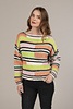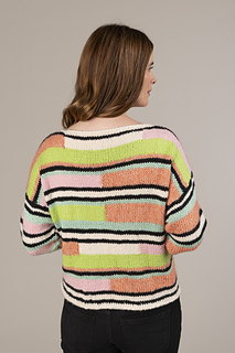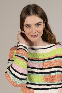Cropped pullover with wide scoop neck is worked in pieces from the bottom up (beginning with an I-cord cast-on), then sewn together. The entire piece is worked in intarsia.