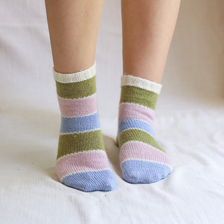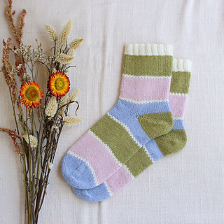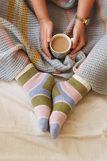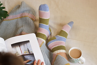 These socks are the perfect canvas for colour play. The slip stitch detailing between colour changes not only adds interest, but also removes the need to use a jogless stripe method. A quick and cosy sock perfect for sock knitters of all skill levels!