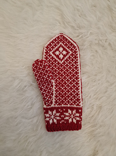 Storleken passar en mellanstor damhand och vanten blir ca 10 cm bred.