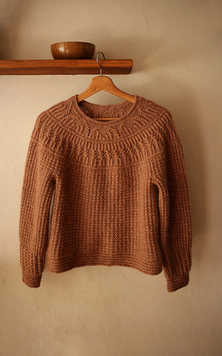 This round-yoke pullover is knit top-down in the round. The lower yoke, body, and most of the sleeves are worked in a waffle pattern on the wrong side of the fabric. The design combines a variety of textured patterns, including half-twisted rib, cables, and garter stitch.