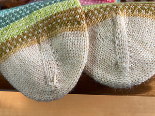The sock is toe-up gusset and heel flap construction with all the information you’ll need to successfully work this technique. Ease has been added to counteract the natural tendency of colorwork stranding to create a firm, more dense fabric.