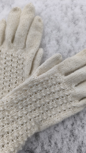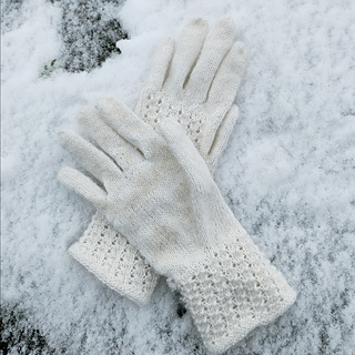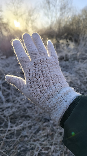 The pattern is worked from a chart and is a simple lace pattern that creates a rib-like effect, helping the glove fit comfortably around the hand. The thumb is also shaped to follow the hand for a better fit.