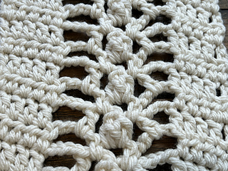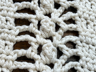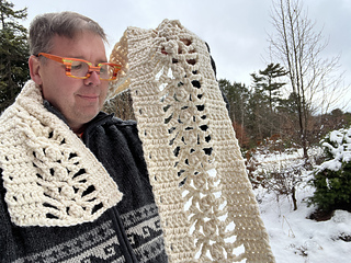 Create a textured, lace-like crochet scarf with a suspended middle section that resembles a floating snowball line running throughout the scarf.