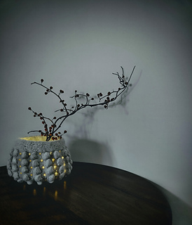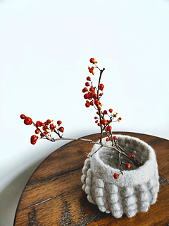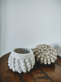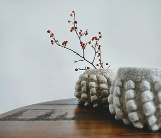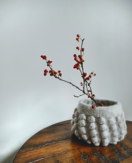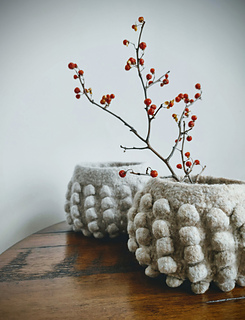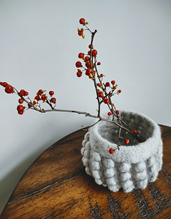 Snowbowl is knit in the round from rim to base. The texture is created by a mixture of slipped stitches, yarn overs and bobbles. Once completed the bowl is felted. The Snowbowl stitch pattern was inspired by the large snowflakes that gently descend when temperatures are near freezing. A perfect holiday gift when filled with some thoughtful additions- maybe a plant, maybe some knitting notions.