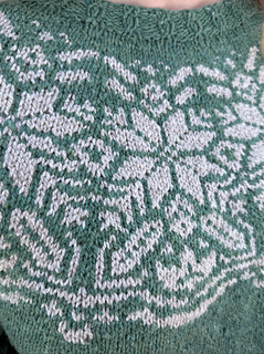 This pattern is suitable for an adventurous beginner who is familiar with colorwork adn wants to take on a larger project. The yoke goes by quickly using only one contrast color and short intervals of stitches minimizing the need to tack.