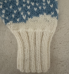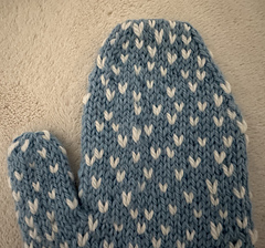 The design mimics a softly falling snow. The mittens both use the same easy to read chart. The yarn I chose is Berroco Vintage DK. It’s a wool blend for warmth, but also washable. I would dry these flat.