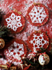 Each snowflake has a solid red background piece. Narrow gold metallic ribbon.