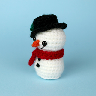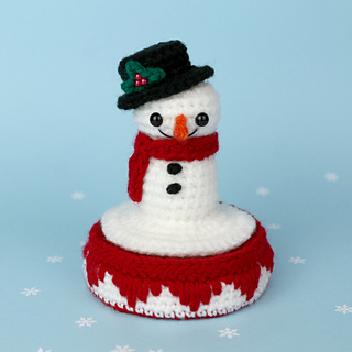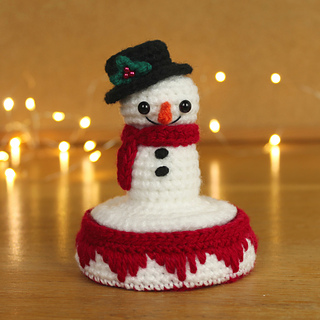 If made with DK yarn, the snowman is about 7.5 cm (3”) tall without the base, and the bowl is about 8.5 cm (a little under 3.5”) diameter and 2.5 cm (1”) tall.