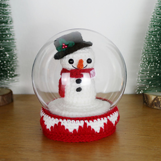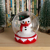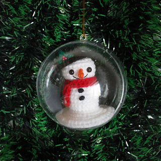 While this small snowman was designed to fit in a clear plastic ball ornament to look like a snow globe, it could contribute to your Christmas decorations in many ways: inside the transparent shell as a round ornament hanging from the tree; without the globe, using the upside down bowl as a platform; or as a standing or hanging ornament on its own without the white base.