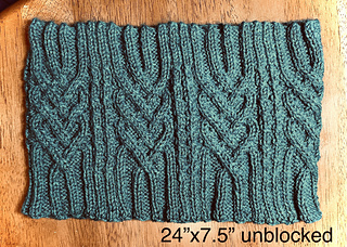 • Large circumference cowl: 30.75” / 78 cm circumference and 5.5” / 14 cm tall after blocking