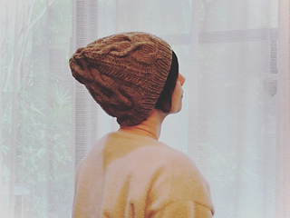 頭周りのリブから編み始めて, 上に向かって、減らし目をしながら編み進めます. 減らし目の部分が見えないように, ケーブル編みの中で減らし目をする方法を使いました.