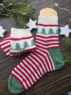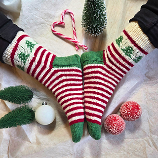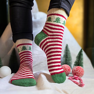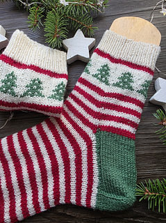 Diese Socken bringen sofort Feststimmung in deine Strickprojekte: Am Schaft zeigt sich ein liebevoll gestaltetes Tannenbaum-Muster, das wie ein kleiner Wald aus Maschen wirkt und den klassischen Ringeln eine besondere, winterliche Note verleiht.