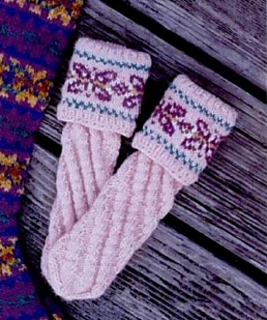 This is a spiral knit tube sock for babies with a stranded colorwork cuff. Yardage is not given but 5 colors in a sportweight yarn are needed.