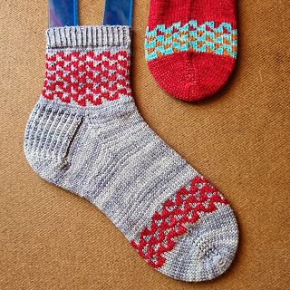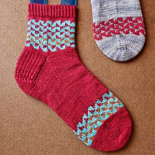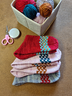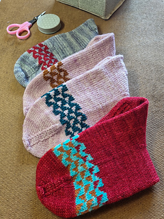 This versatile design offers three different versions by combining two or three colors, making it perfect for using mini-skeins or yarn scraps with one main color. The same simple chart transforms completely when you change the contrasting colors, allowing you to create entirely different looks while maintaining the same geometric design.