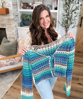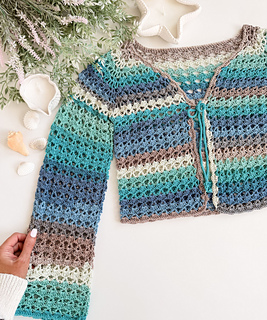 The Solea Shell Stitch Cardigan is a seamless, top down summer layering piece featuring delicate shell and V stitches. Designed for versatility, it can be made with short or long sleeves and customized to your preferred length.