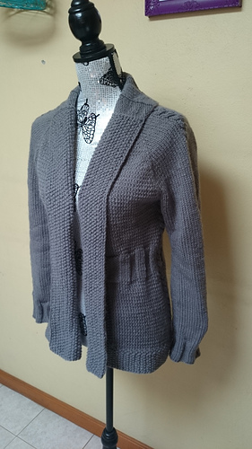 Solstice is cast on at the top of the back of the collar and this part of the collar is worked in rib to the neck. Then the yoke shaping and body pattern stitches begin and stitches for the front collar sections are cast on then the sweater is continued in one piece (except for the pockets). The ribbing at the waist provides a simple bit of waist shaping. Once the body is complete, the CO edges of the front collar sections are seamed to the sides of the back collar section.