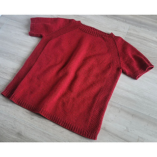 The tee is knitted top down in rounds. First the back neck is shaped using short rows followed by a raglan yoke. The raglan lines are knitted in Seed Stitch pattern while the rest of the tee is knitted in Stockinette Stitch to create a stitch contrast. After dividing the work in sleeves and body the raglan lines go over to side stripes that continue in Seed Stitch pattern. The tee is finished by knitting the sleeves in round using Stockinette Stitch. All edges are worked in Ribbing Stitch pattern.