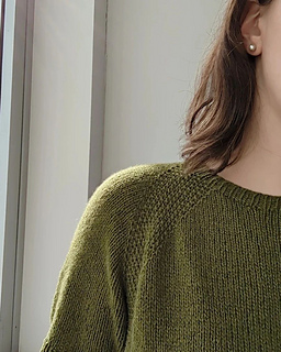 Das Shirt wird von oben nach unten in Runden gestrickt. Als erstes wird der Nackenbereich mit Hilfe von verkürzten Reihen geformt und anschließend die Raglanpasse gearbeitet. Die Raglanlinien werden im kleinen Perlmuster gestrickt. Der Rest vom Shirt ist im schlichten Glatt Rechts Muster als Kontrast zum kleinen Perlmuster gearbeitet. Nach der Abtrennung der Ärmel gehe die Raglanlinien in Seitenstreifen über, die ebenfalls im kleinen Perlmuster gehalten sind. Das Shirt wird mit dem Stricken von den Ärmeln im Glatt Rechts Muster beendet. Alle Bündchen sind in einem Rippenmuster gestrickt.