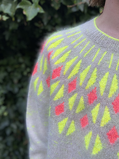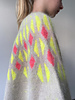 SPARKS is a colourwork yoke sweater with a relaxed yet elegant fit, knitted in one piece from the top down. It can be knitted in either a fluffy blend of fingering weight yarn combined with a suri silk alpaca (or mohair) or in a single held DK weight yarn. Starting point for this design was the yarn and especially the strikingly vibrant colours of the hand dyed PRU yarns. The catchy colours on different yarn bases immediately inspired the creation of a radiating deep colourwork yoke, like a big shiny collar around the neck, where the sparkle of the PRU yarns and enchanting colourwork shapes go hand in hand.