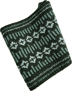 Halsvarmeren er strikket med en bunnfarge (BF) og to mønsterfarger (MF1/MF2).