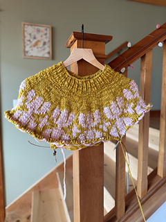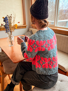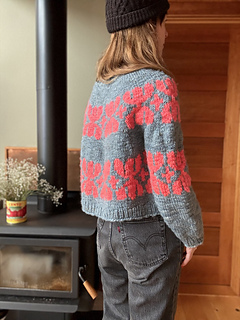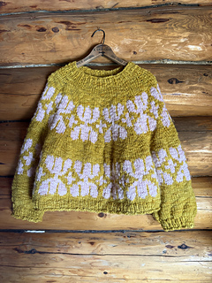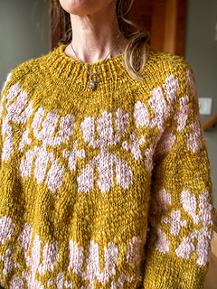 Splot is knit from the top down in the round featuring short row shaping for the back neck and a bold motif on the yoke, body and sleeves.