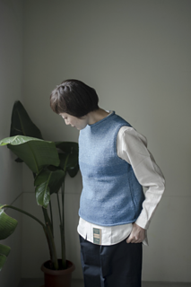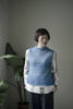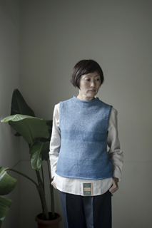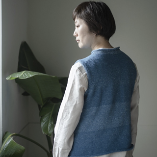 裾から輪で編み , 前後に分ける . 袖ぐり減目の後 , 肩と襟ぐりを引返しで作る. 肩をはぎ , ネックと袖ぐりを編む .