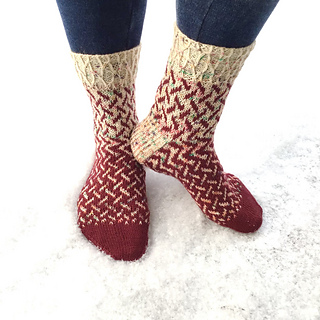 Fingering weight sock yarn in 2 colors. Designer used Knit Picks Hawthorne in colorways Burlingame and Klamath Falls.