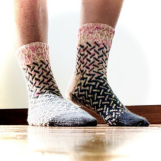• Or sizes needed for fit - a larger needle (2.5 mm) may be necessary to get gauge in colorwork plus one size smaller for the ribbing, heel, and toe (2.25 mm).