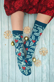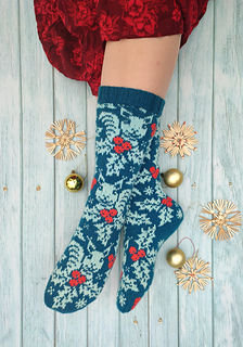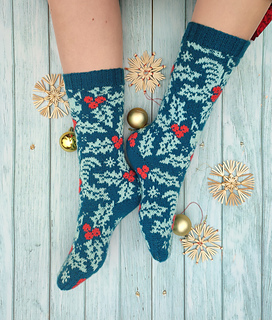 The socks are knitted from the cuff down in stranded knitting with two colors per row. The third color, i.e., the red of the berries can be left out altogether or added in duplicate stitch at the end. The pattern uses an easy pyramid heel; the heel is knitted in the round alongside the leg and only the gusset decreases are worked back and forth. The leg of these socks is quite long (approx. 9.8 in / 25 cm) and has no shaping so it is best suited for a slim calf. A wider calf sock can be created by leaving out the first squirrel. The length of the foot is adjustable.