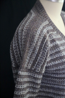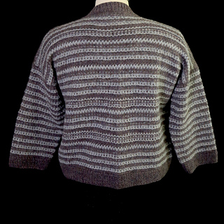 SS Exploration is a loose-fitting, drop-shoulder cardigan with a V-shaped neckline and 3/4 sleeves. Construction is bottom up, knitted flat in one piece. Sleeves are picked up and worked after the body is completed. The lower edge of the garment and the front bands and neckband are worked in K1P1 rib. Three different slip-stitch patterns are used to create the stitch detail in the design. This garment is perfect for the knitter who wants to explore working with slip stitches.