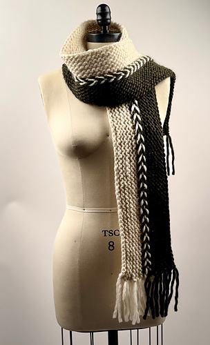 Cozy and quick to knit, the St Clair Scarf is the perfect gift project when time is short. Two contrasting colors meet with a Latvian braid in the middle to make the transition. It’s surprisingly simple and definitely eye-catching.