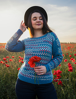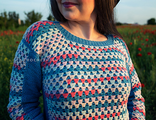 The Stained Glass Jumper reimagines one of crochet’s most iconic stitches, the granny stitch, in a way that feels both nostalgic and refreshingly modern. Layers of color and texture form a reversible fabric full of movement and depth: on one side, a crisp mesh overlay creates a grid of “stained glass” panes; on the other, the familiar granny clusters shine through in shifting tones.