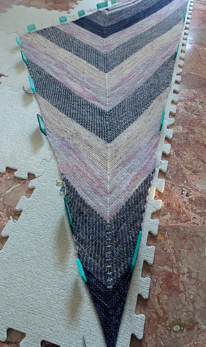 Starry summer night is an asymmetrical triangle shawl, it’s knit with garter and pearl brioche. It’s a squishy and warm shawl, much like the feeling of your feet sinking in the warm sand on a summer evening walk on the beach.