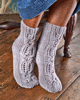 Beautifully soft and snuggly, these chunky socks will be a treat for your feet on chilly winter days and nights! They’re knitted in The Fibre Co. Tundra, a blend of baby alpaca, silk and Merino that comes in a range of rich, shimmering colours. Caroline Birkett’s design has a lace and cable panel down the front, a column of garter stitch down the back leg, and a slip stitch heel.
