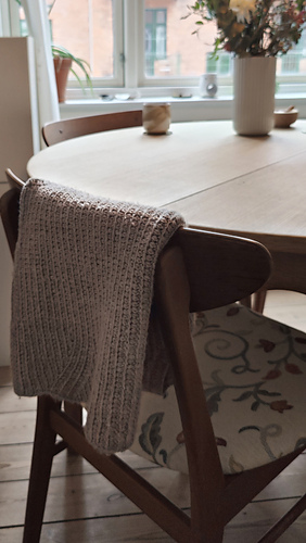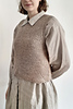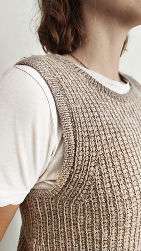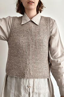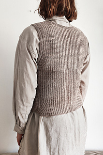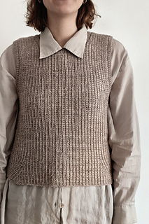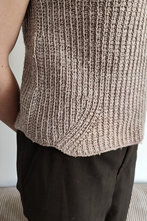 En dejlig vest lavet i tunesisk hækling med fine detaljer omkring ærmegab og i bunden. Kanterne er strikket på til sidst.