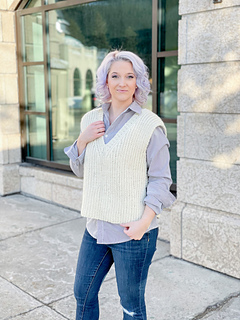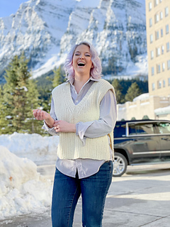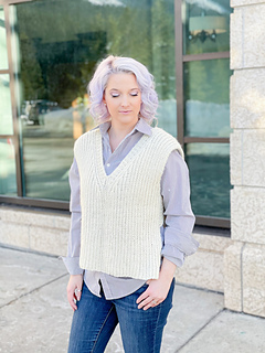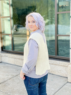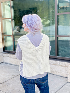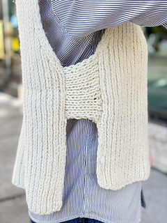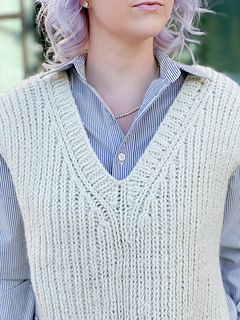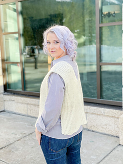 Who doesn’t love a cute lil’ vest that has a mitred collar? With a modern twist of straps on the side, this vest is easy to pull over top of a collared shirt or turtleneck. Knit in 1x1 rib and with 1-3” of positive ease it’s a must have for your wardrobe.