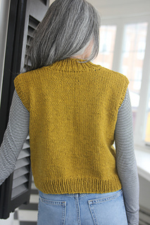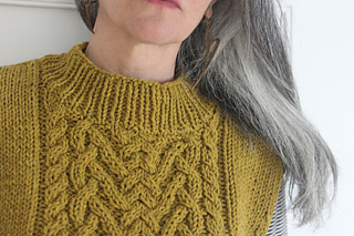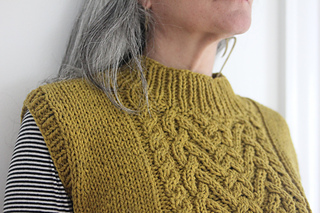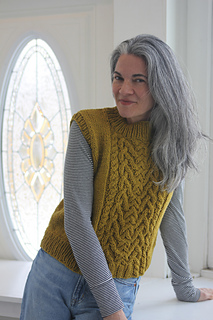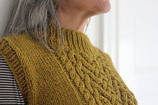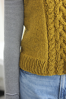 Pattern is worked from the bottom up in the round. Vest are separated into front and back at armhole and pieces knit flat to shoulder. Armhole and collar stitches are picked up and worked in the round after shoulders are seamed.