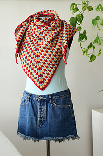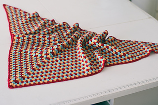 Stillpoint is a triangular crochet shawl worked flat in back-and-forth rows using the classic granny stitch. The shawl is made as one piece from the top center outward, with three colors alternated one row at a time and unused yarn carried along the edge without cutting. A simple single crochet edging is added along the longest side. Designed for DK weight yarn, the pattern is easily adaptable to other medium-weight yarns with an appropriate hook to achieve desired drape.