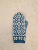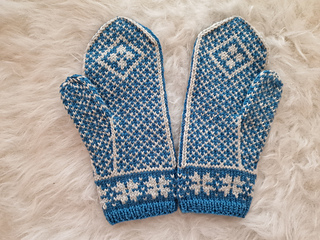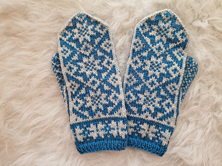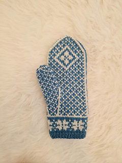 Mudden är stickad med 3,00 mm och själva vanten är stickad på 3,50 mm.