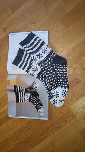 Järbo Mellanraggi og pinner 2,75 mm. Med 18 cm legg og 26 cm fot: Totalt 121 gram garn. Herav 70 gram i bunnfargen og 51 gram i kontrastfargen.