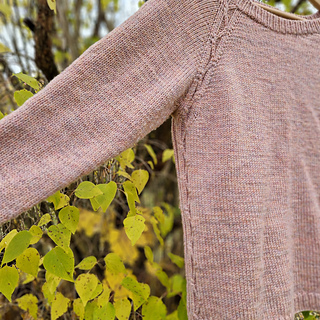 The sweater is designed with a round neckline and is worked top-down with a raglan yoke featuring textured stitch patterns between the raglan increases, which continue down along the sides of the body.