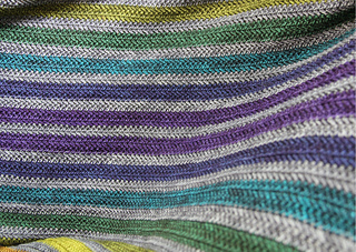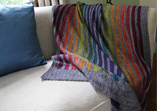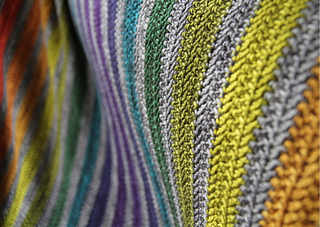 19 sts and 15 rows over 10cm/4” (unblocked). 17 sts and 13.25 rows over 10cm/4” (blocked). It is important to get gauge. If you don’t, you risk running out of yarn in the final contrast colour rows of the blanket.