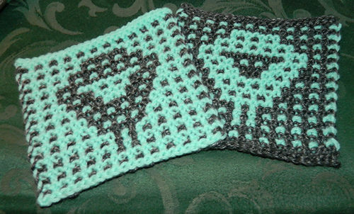 Arrange stray sheep on the furnishings to wick up moisture and protect it from drinkware. Worked in mosaic garter stitch, just one strand of color works every two rows. Gauge and dimensions are provided in a light worsted weight yarn. Choose colors that contrast well. Try your camera’s “black & white” setting to look at your yarns in grayscale and check the contrast between your selection(s). The pattern provides full written instructions with (optional) positive and negative charts for making useful household linens and gifts!